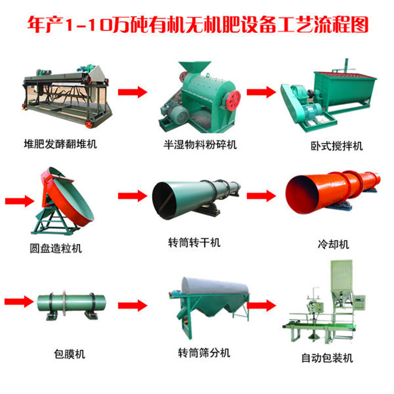 有機物發酵→翻堆機翻堆→皮帶輸送機→濕式粉碎機→人工投料→配料1(有機肥)\配料2(氮)\配料3(磷)\配料4(鉀)\配料5(添加劑)→自動累積配料→皮帶輸送機→單軸混合機→輸送機→回轉篩→